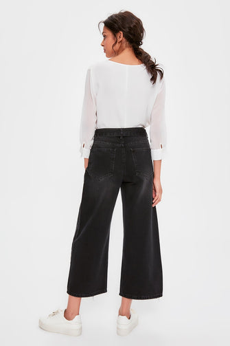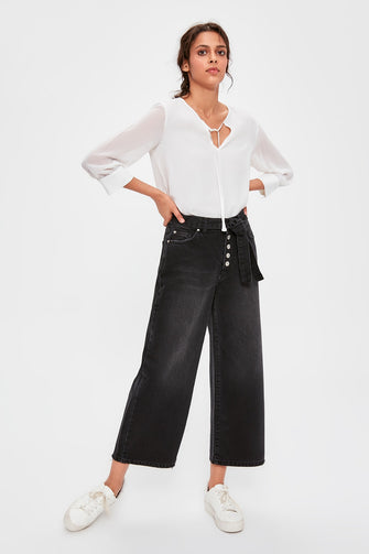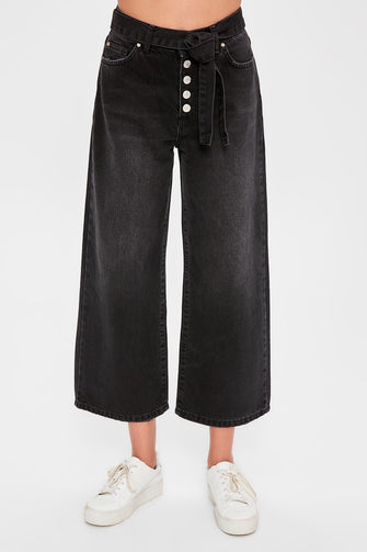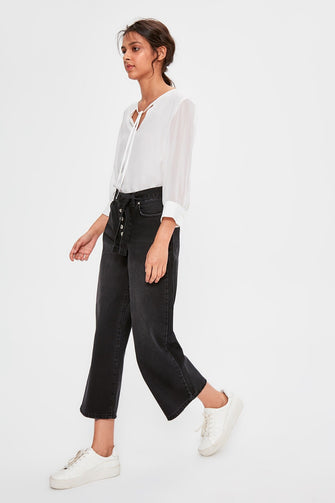 Black Lacing Detailed Front Button High Waist Wide Leg Jeans