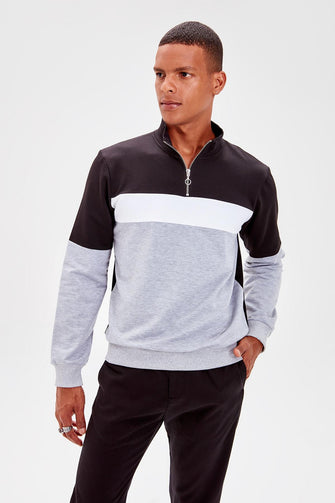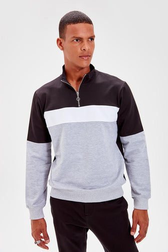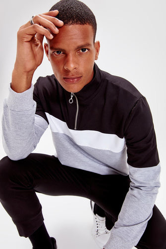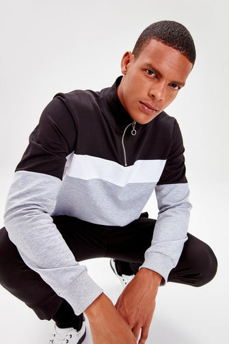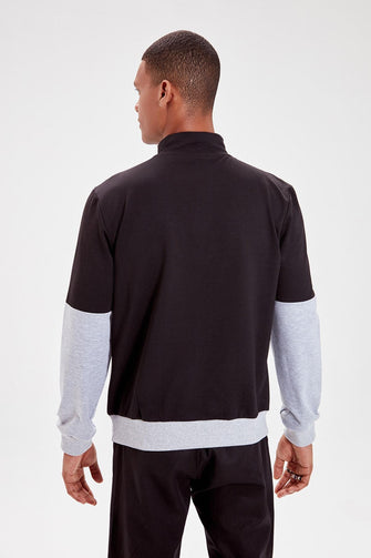 Black Men Panelled Long Sleeve Crew Neck Zip-up Sweatshirt