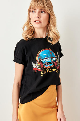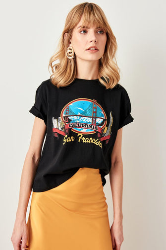 Black San Francisco Printed Boyfriend Knitted T Shirt