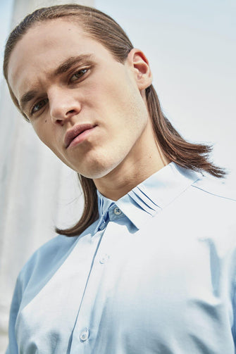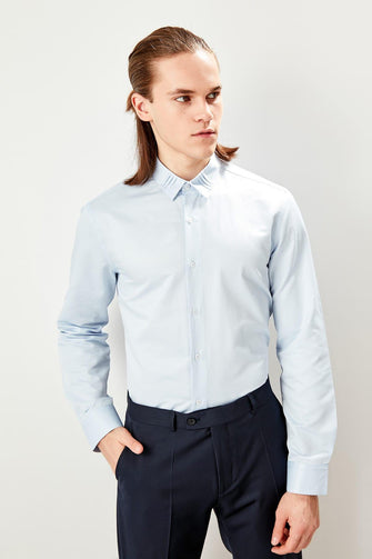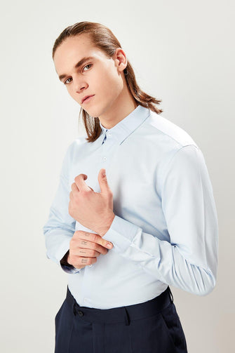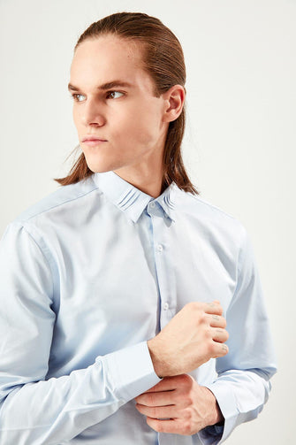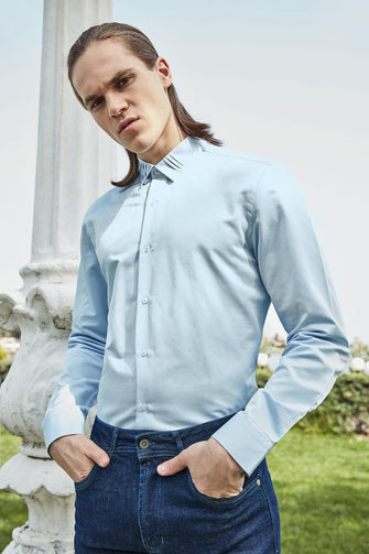Blue Male Pattern Collar Hidden button Smart Slim Fit Prom Groom Shirts