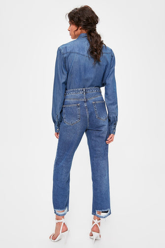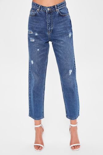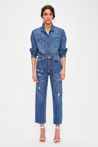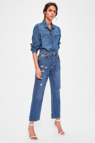 Blue Ripped Detailed High Straight Jeans