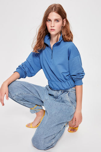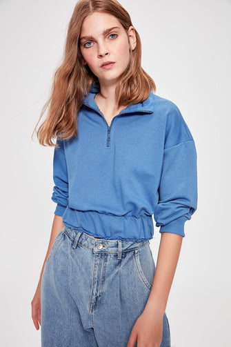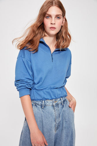 Blue Detailed Crop Knitted Sweatshirt