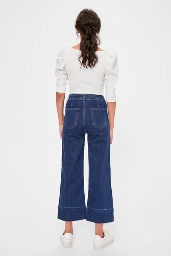 Blue Stitch Detail High Waist Culotte Jeans