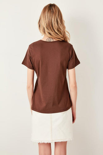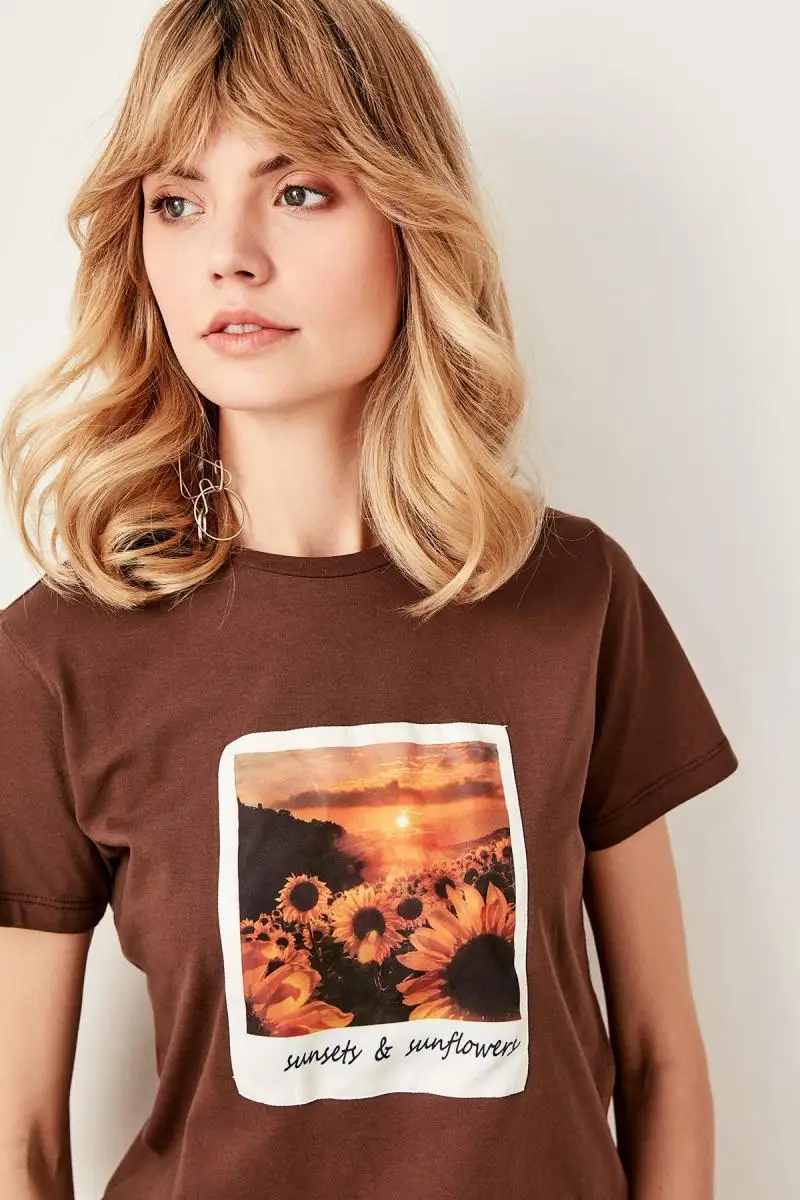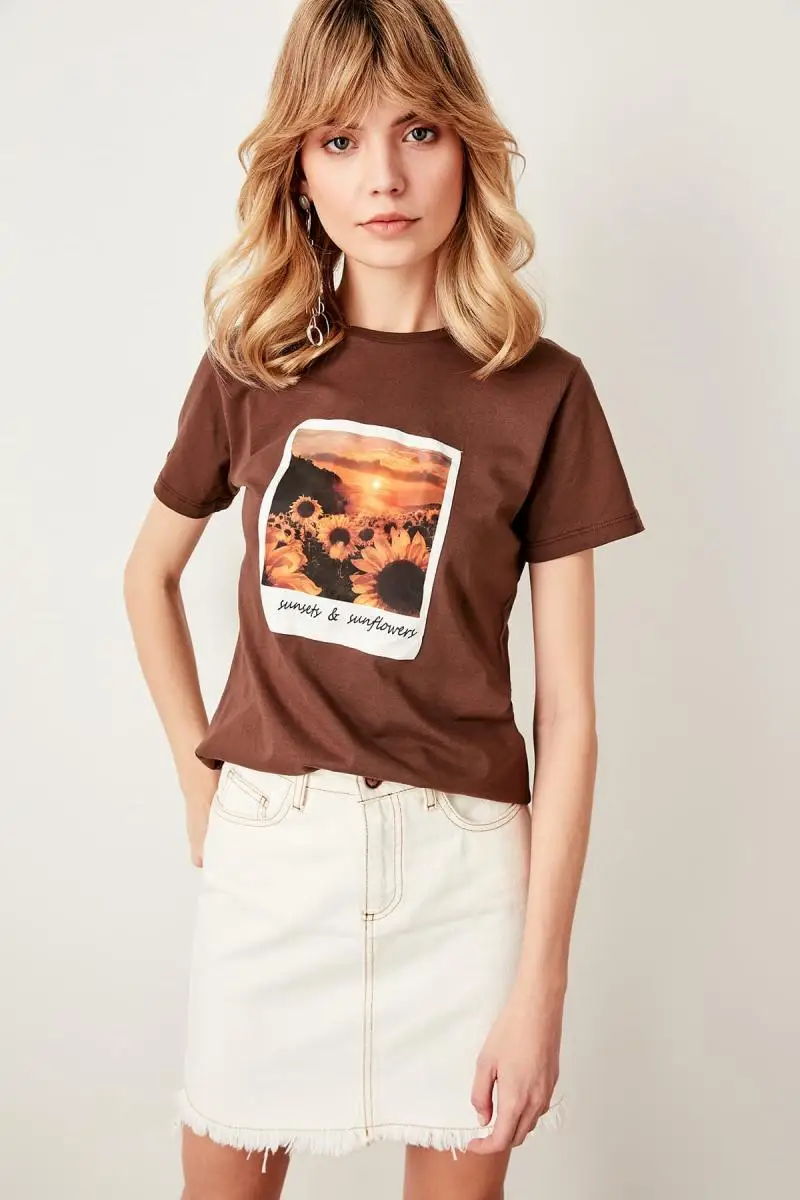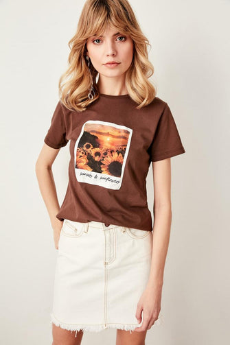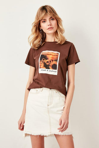 Brown Polaroid Printed Basic Knitted T-Shirts