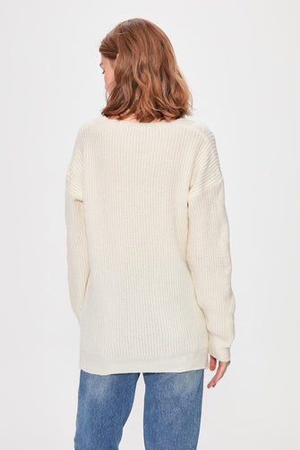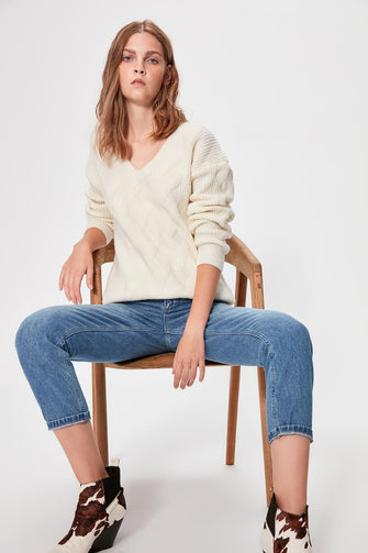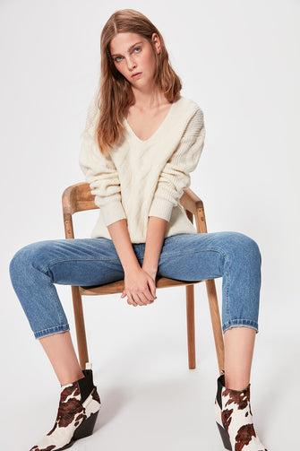 Ecru Hair Braided V-Neck Knitwear Sweater