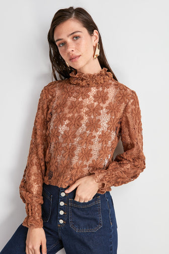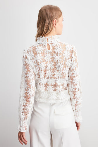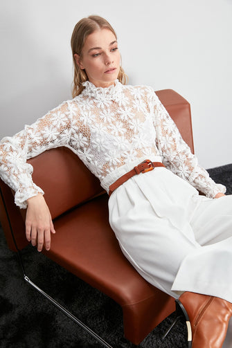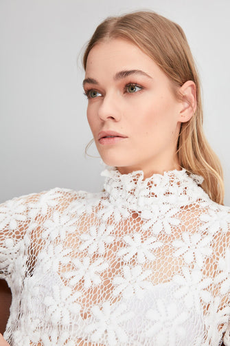 Filet Lace Detailed Upright Collar Knitted Blouse