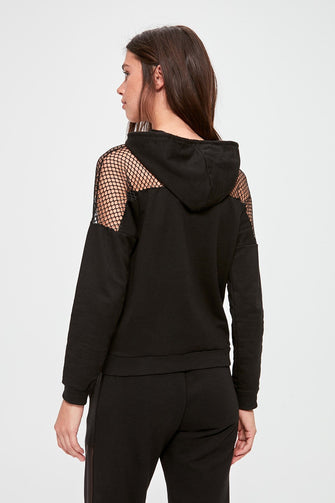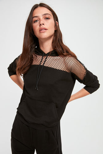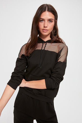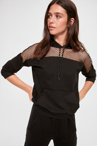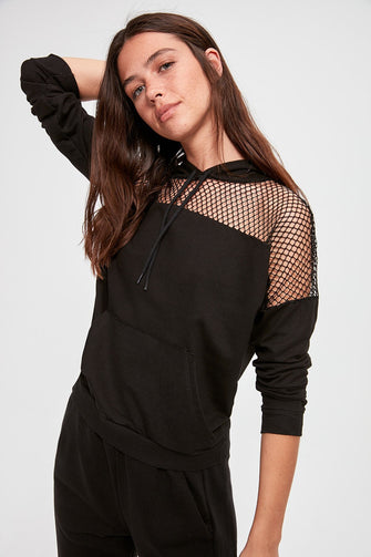 Fishnet Detailed Hooded Knitted Sweatshirt