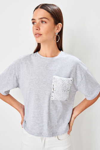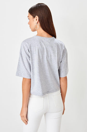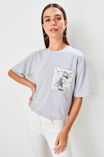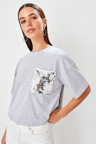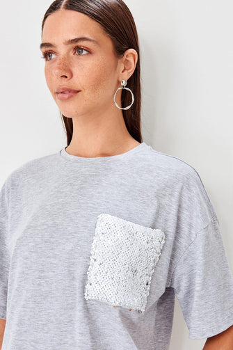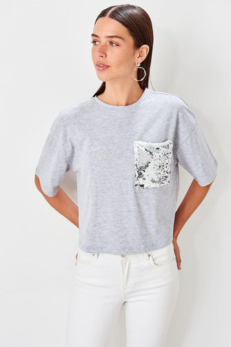 Gray Sequin Pockets Loose Mould Örme Crop Top T Shirt