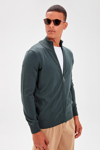 Green Male Basıc Upright Collar Front Zipper Cotton Sweater Cardigan New