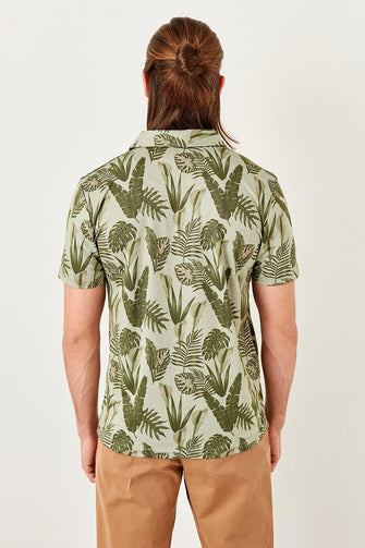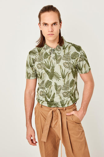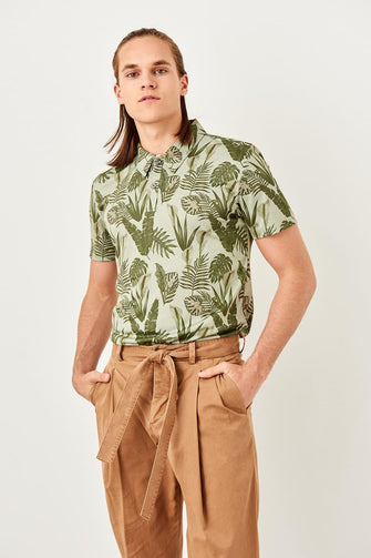 Green Men Leaf Printed Front Button Polo Collar T-Shirt