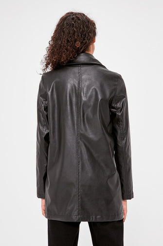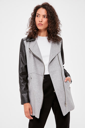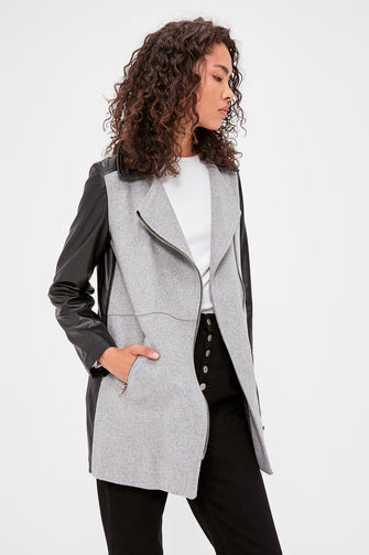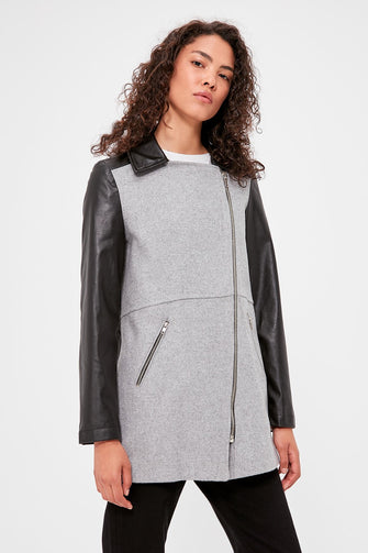 Handles and Back Faux Leather Zip Detail Stamp Coat