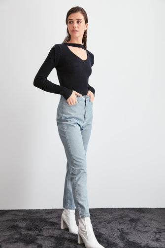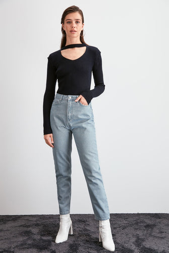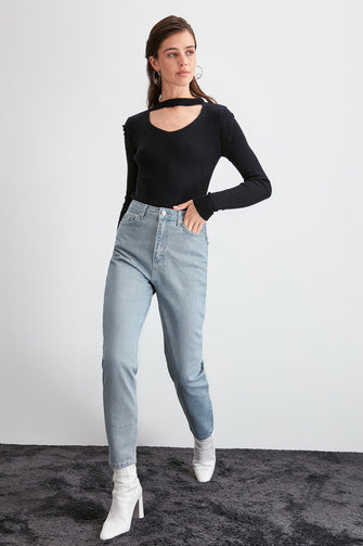 - Button and Zipper Closure, High Waist Mom