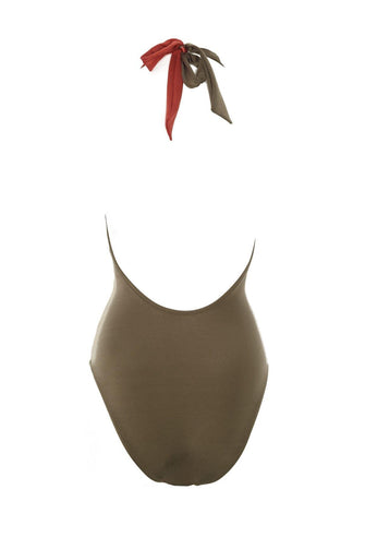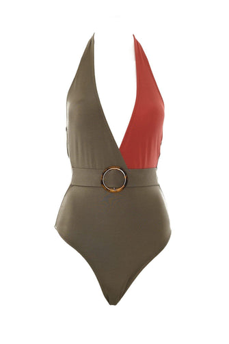 Khaki Cinnamon With Color Block Double Breasted Collar Swimwear