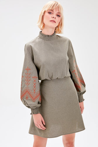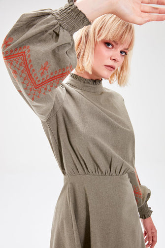 Khaki Embroidery Detail Dress