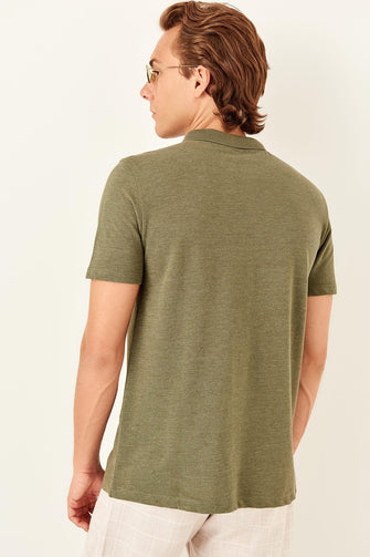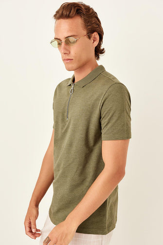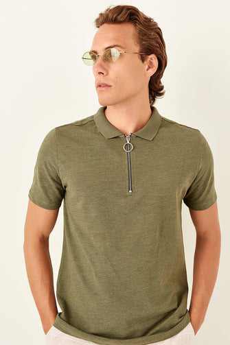 Khaki Men 'S Collar Zipper Short Sleeve New Polo Collar T-Shirt