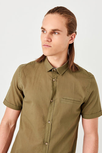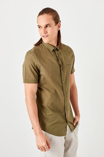 Khaki Men 'S Short Sleeve Shirt Collar Pockets Slim fit Shirt