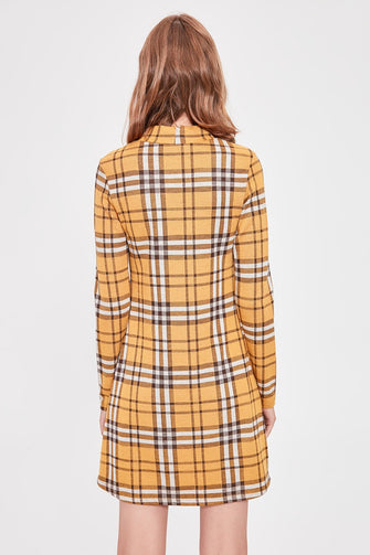 Mustard Plaid Pattern Erect Collar Knit Dress