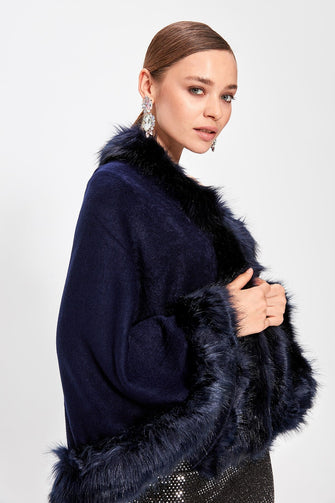Navy Blue Fur Collar Detailed Poncho Shawl