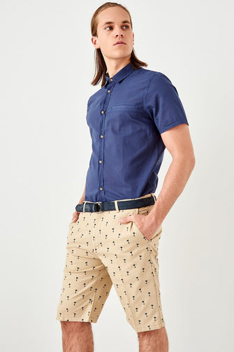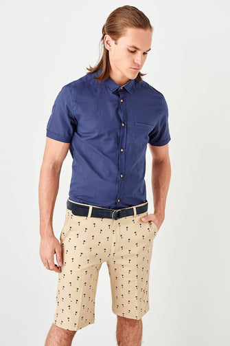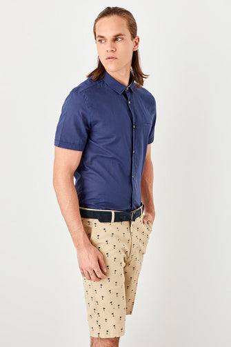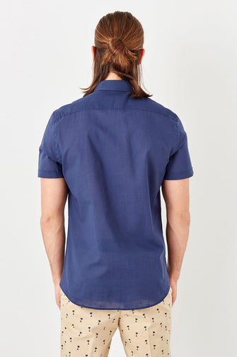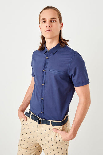 Navy Blue Male Short-Sleeve Collar Pockets Slim fit Shirt
