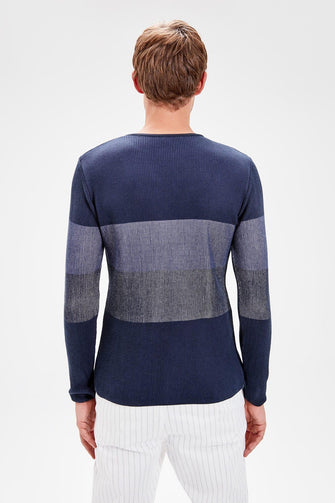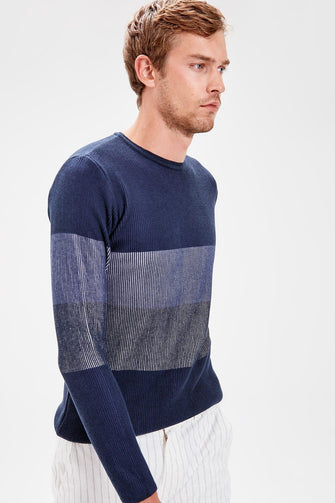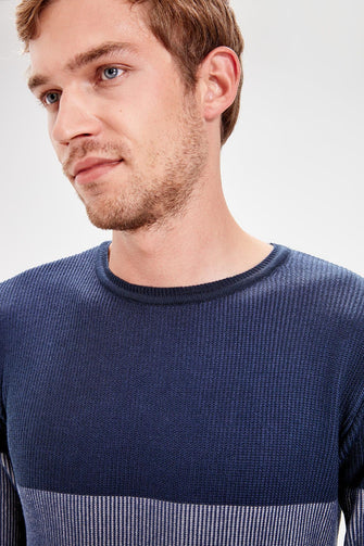 Navy Blue Men Panelled Bike Collar Knitwear Sweater New