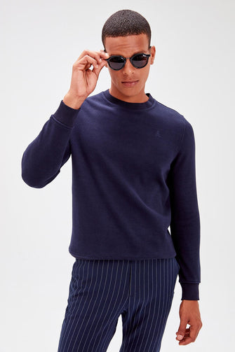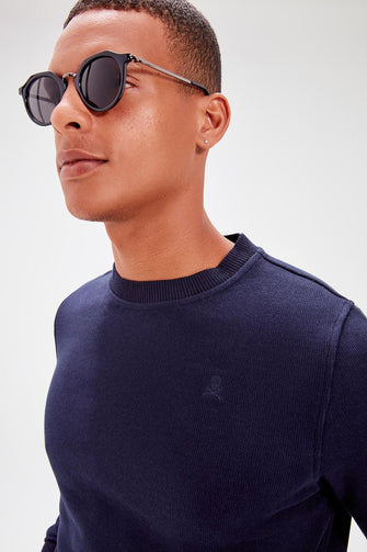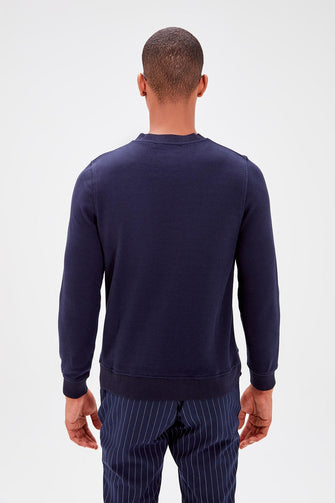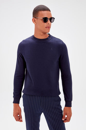 Navy Blue Men 'S Bike Collar Long Sleeve Embroidered Knitted Sweater