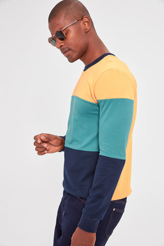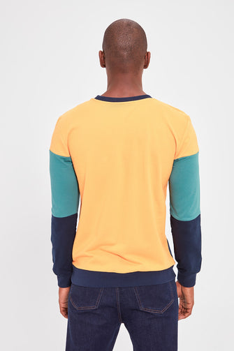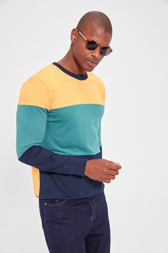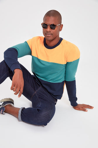 Navy Blue Men 'S Bike Collar Long Sleeve New Paneled Sweatshirt