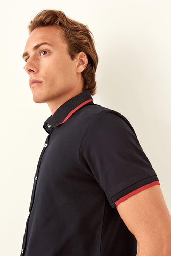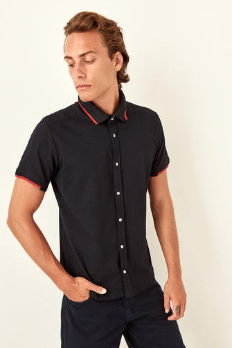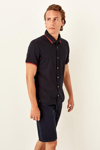 Navy Blue Men 'S Knitted Straped Short-Sleeve Knitted Shirt New