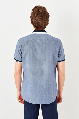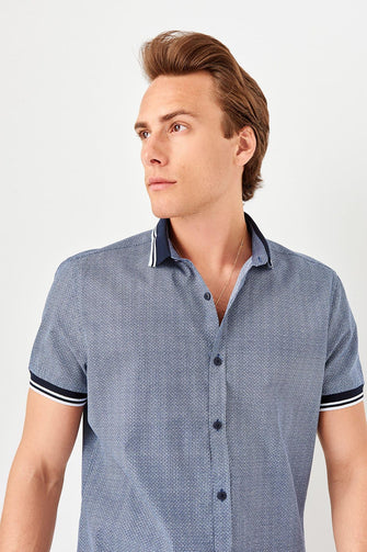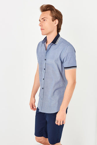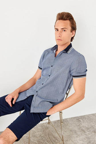Navy Blue Men 'S Knitted Striped Short Sleeve Shirt