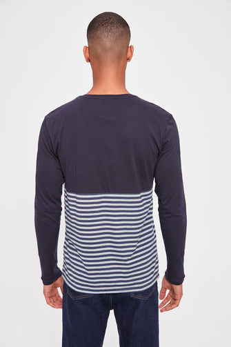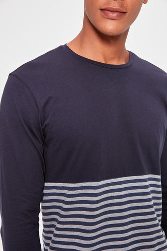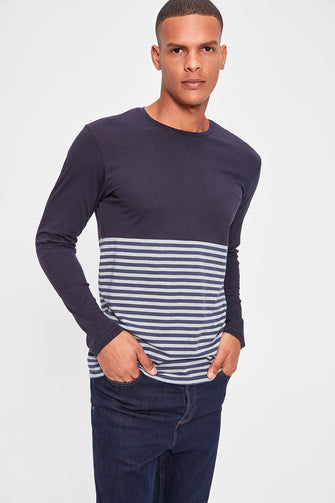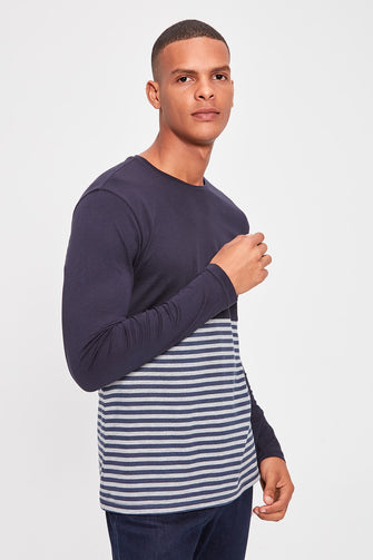 Navy Blue Men 'S Long Sleeve Cycling Collar Striped New T-shirt