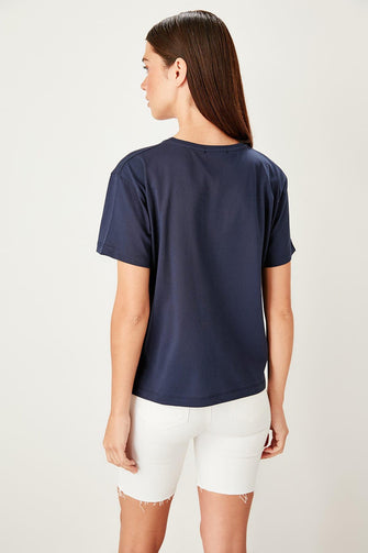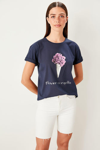 Navy Blue Printed Basic Knitted T-Shirts