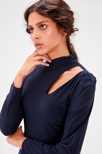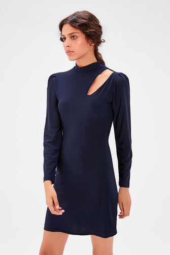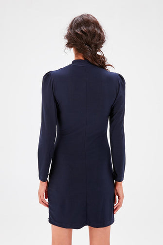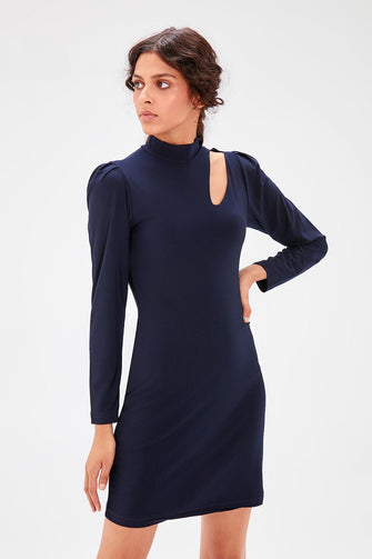 Navy Blue Shoulder Low-Cut Knitted Dress