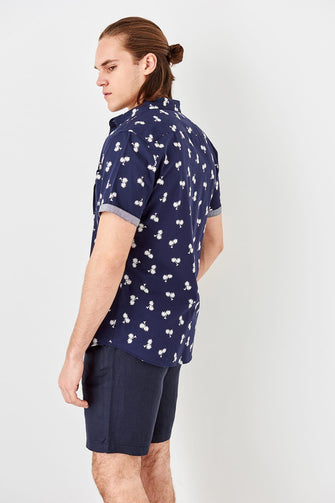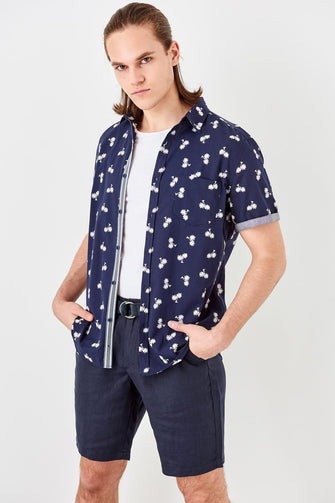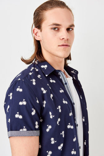 New Navy Blue Male Palm Pattern Short-Sleeve Slim Fit Shirt