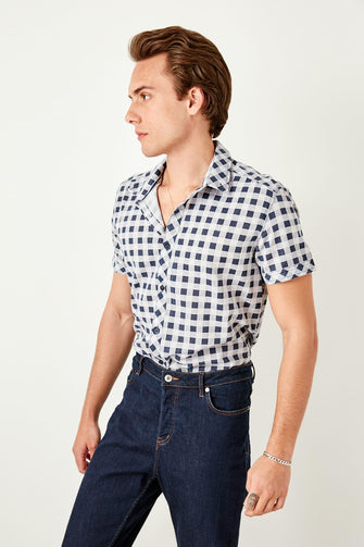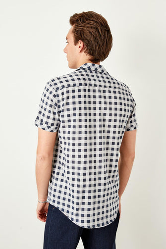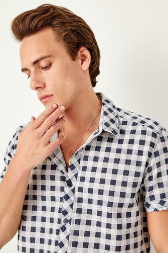 Mens Plaid Button Collar Short Sleeve Slim Fit Shirt
