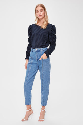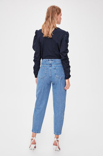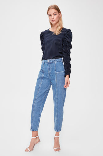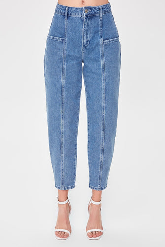 - Button and Zipper Closure, Pocket Detail, High Waist, Balloon