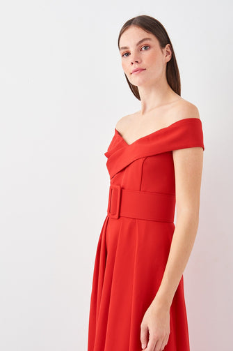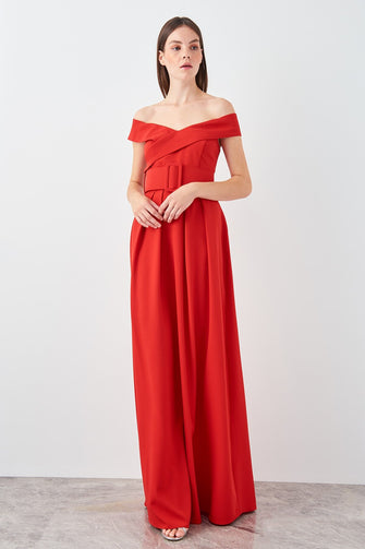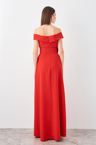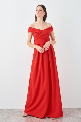 Red Arched Carmen Collar Evening Dress