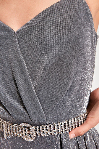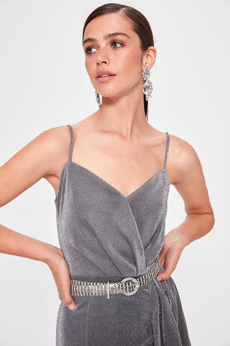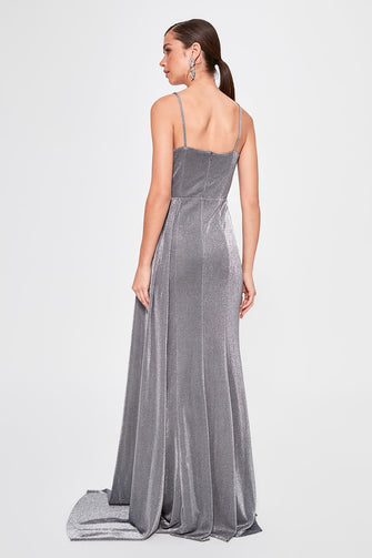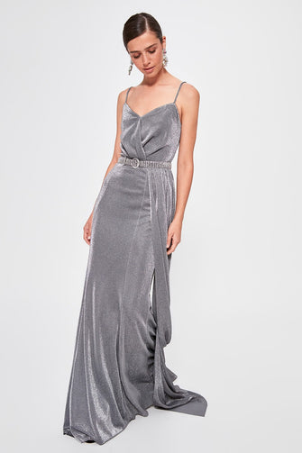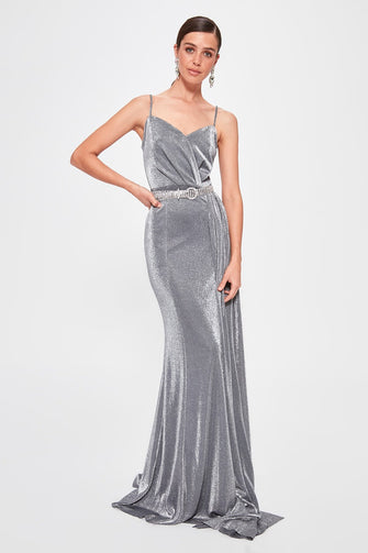 Silver Drape Detail Evening Dress