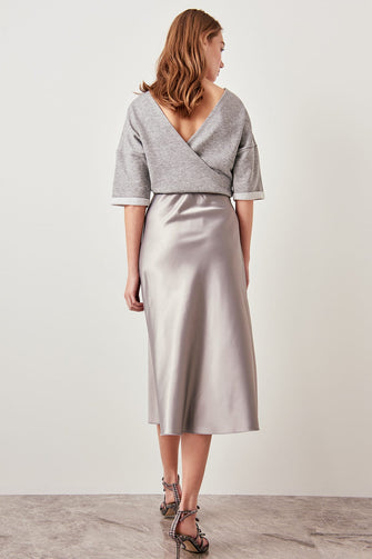 Trendyol Silver Silk Satin Skirt High-waist Women Knee-length Skirt Chic StyleTOFSS19WX0013