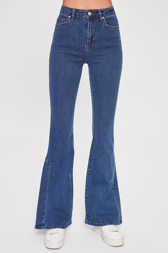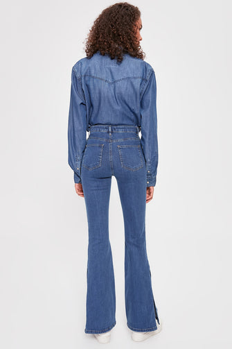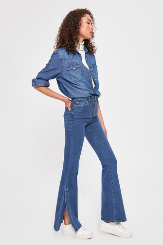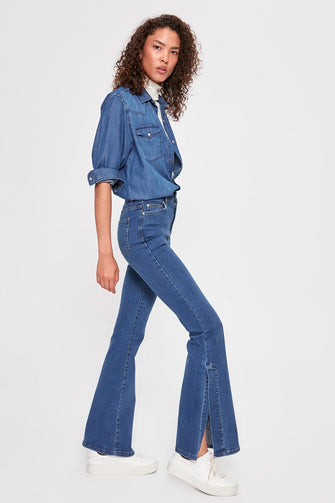 - Button and Zipper Closure, With A Slit High Waist Flare