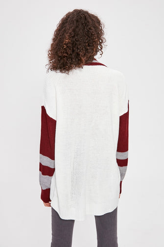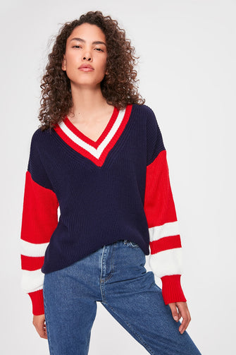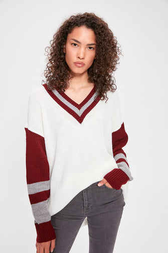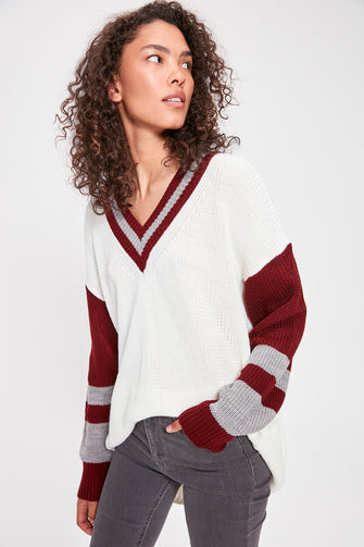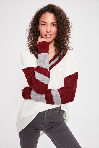 V Collar Sleeves Striped Knitwear Sweater