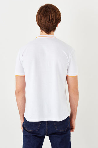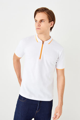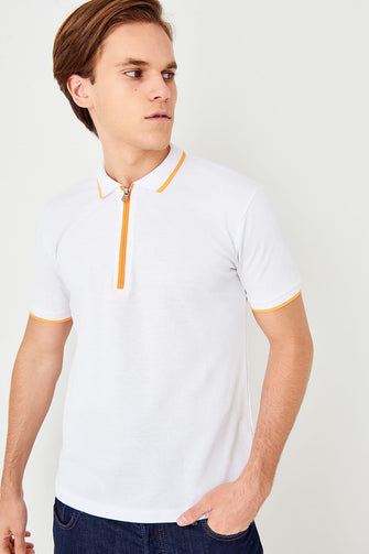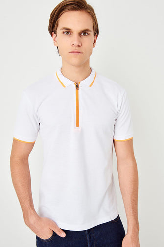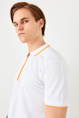 White Male Colar Zipper Neon Bias Tape Detaylı New Polo Collar T-Shirt TMNSS19QA0158