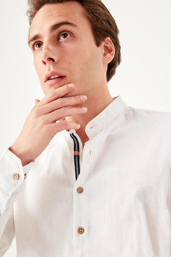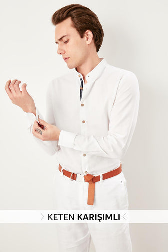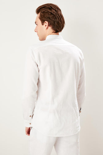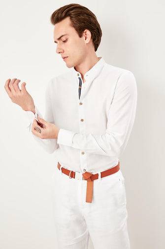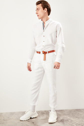 White Men 'S Crew Neck Slim Fit Linen Blended Shirt