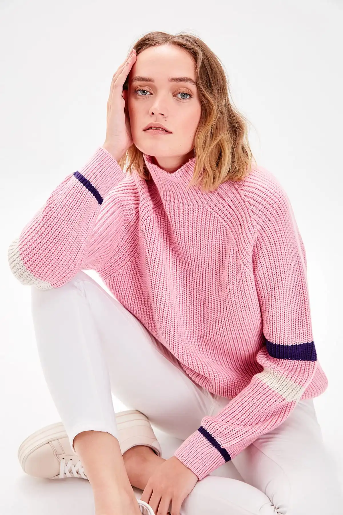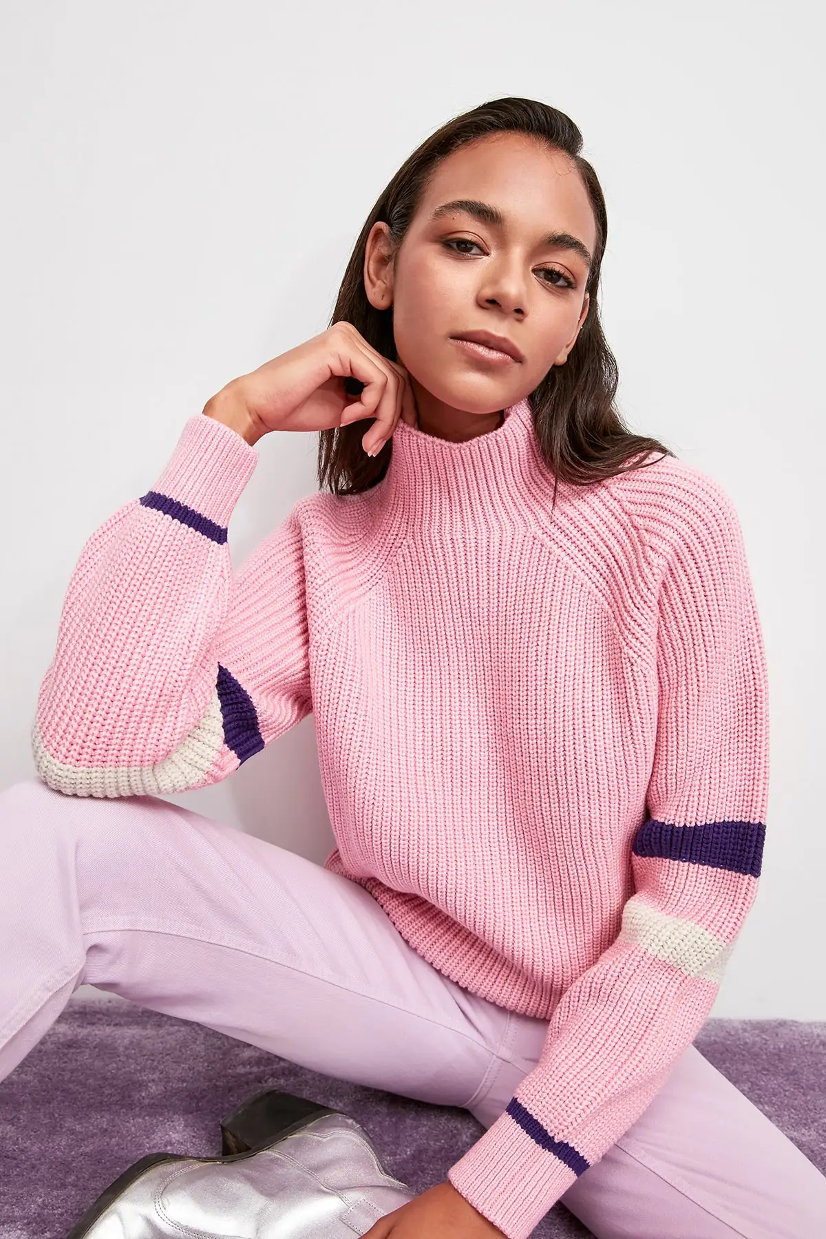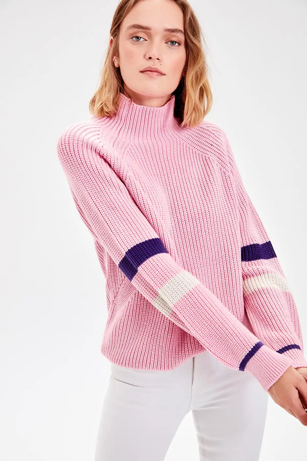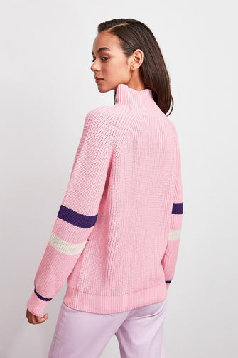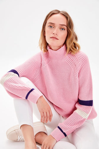 WOMEN-Pink Turtleneck Handle Stripe Knitwear Sweater